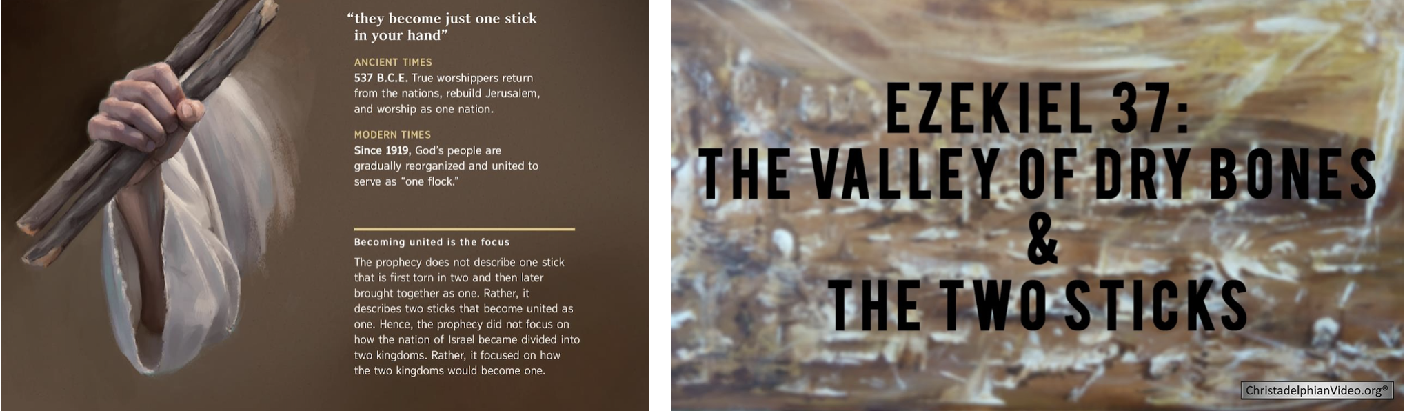 Ezekiel then joins these two sticks together into one stick in his hand. The two sticks represented the kingdoms of Judah and the northern kingdom of Israel (Ephraim), and their union foretold their restoration and secure future in the Promised Land, ultimately a foreshadowing of a unified Church consisting of both Jews and Gentiles. Thus symbolising God's promise that after their scattering and exile, the divided kingdoms of Israel and Judah will once again become one nation under a single king, their Messiah. Ezekiel 37:15-28